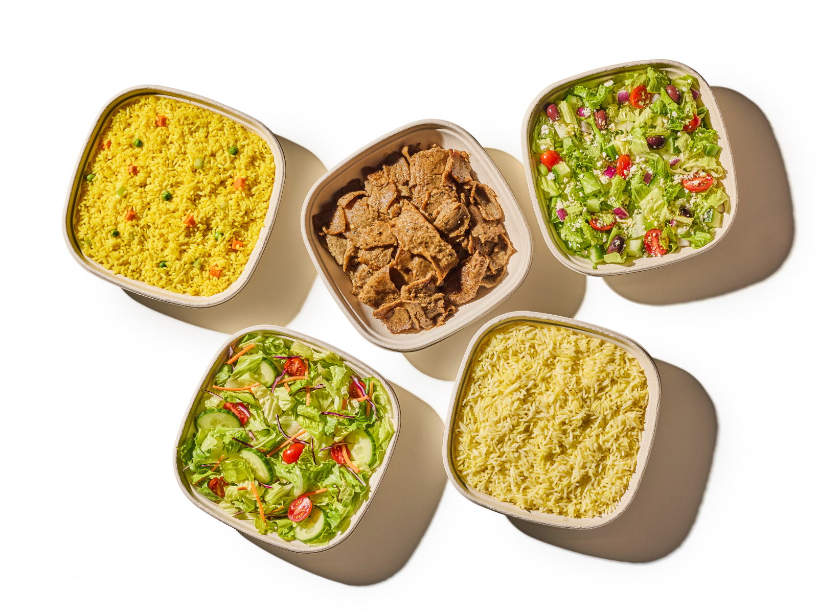 Tender marinated beef and vegetables paired with fragrant basmati saffron rice, fresh house salad with cilantro lemon vinaigrette, and a grilled tomato.